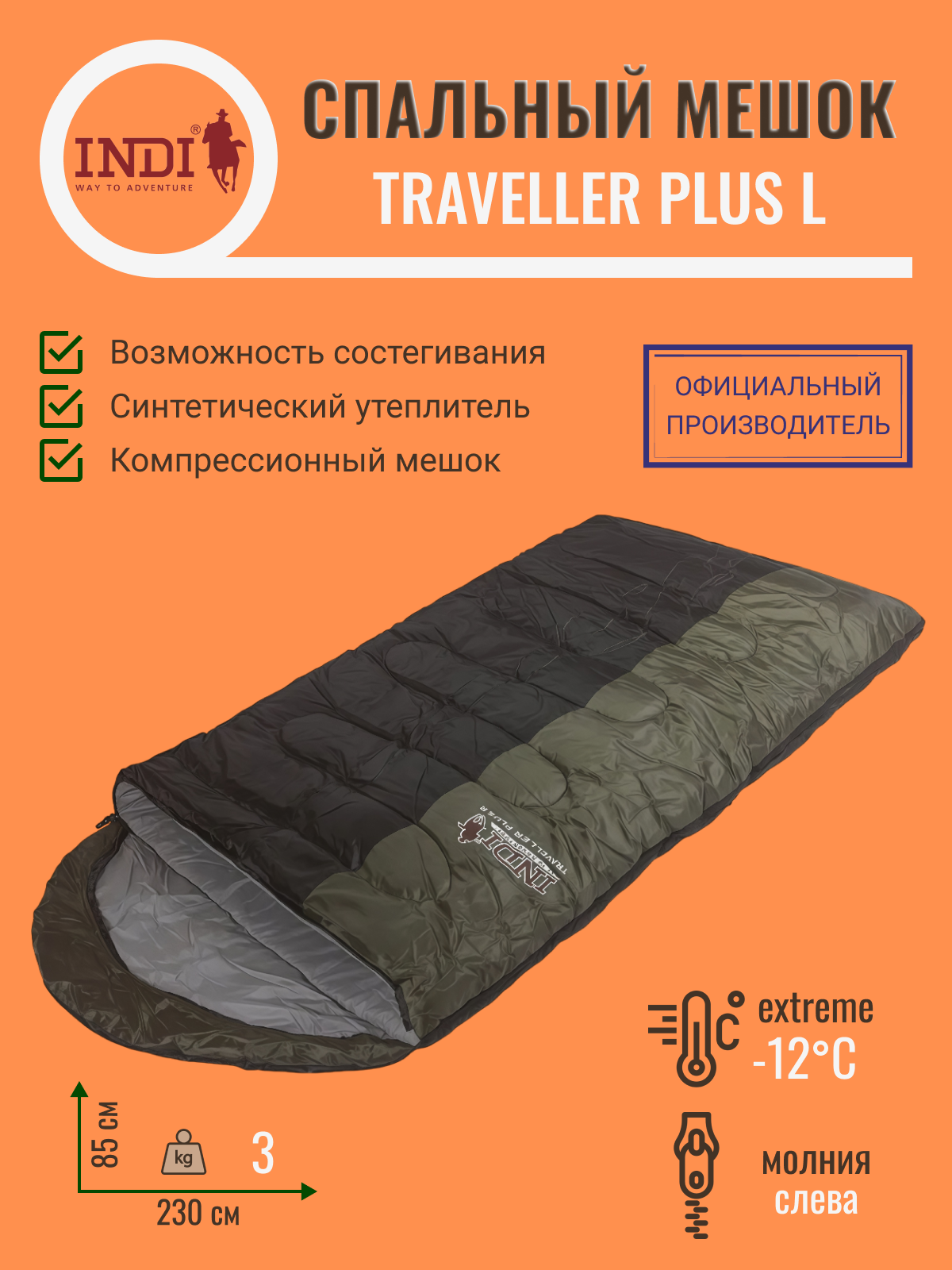 Спальный мешок TRAVELLER PLUS L-zip от -12 С (с подголовником 230x90см)