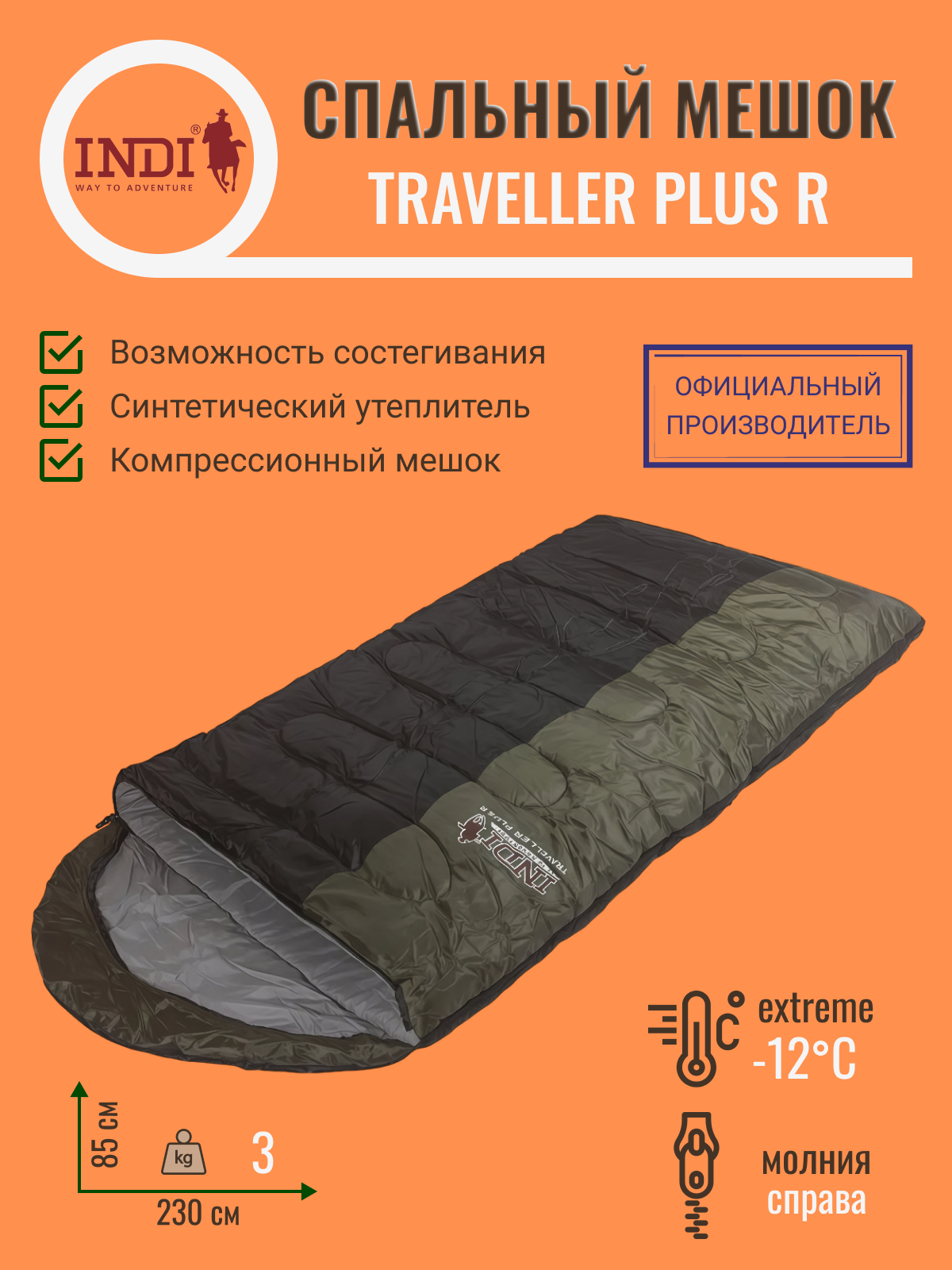 Спальный мешок TRAVELLER PLUS R-zip от -12 С (с подголовником 230x90см)