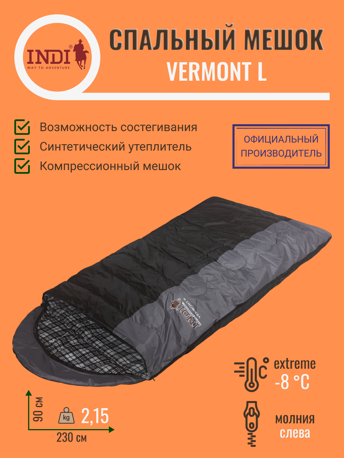 Спальный мешок VERMONT L-zip от -8 С (с подголовником 230x90см)